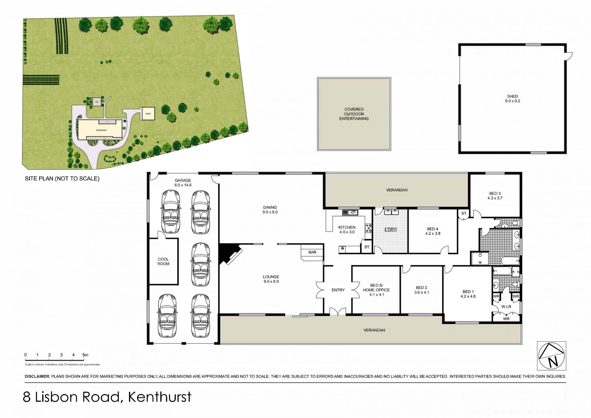 A large shed and five-car garage with internal access provide ample storage.