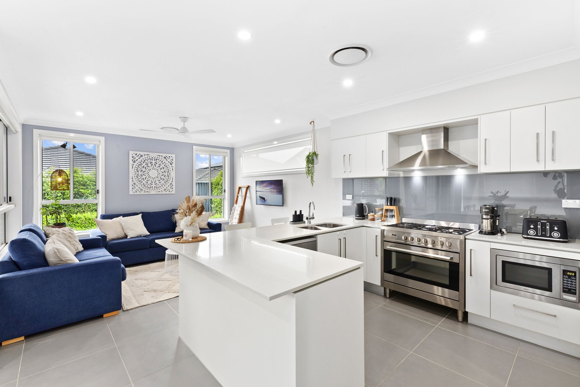The Caesarstone kitchen articulates the living room and meals area, boasting immense storage with a walk-in pantry. Stainless steel appliances include a 900mm gas cooktop and oven, while the bench wraps around to include bar seating. The meals area steps out to a covered alfresco which is perfect for year-round dining. It meets level lawn, edged with professionally landscaped gardens requiring minimal maintenance.