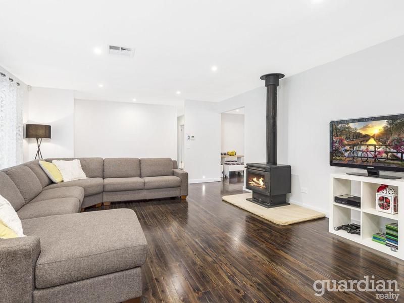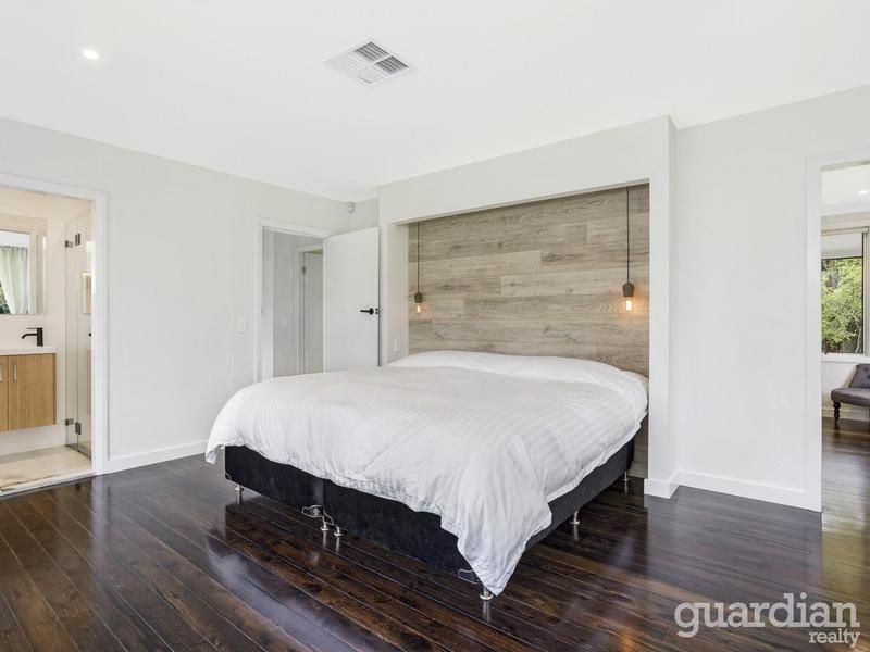 Lime washed cypress pine floors and a white palette overlaid with black accents underpin the French provincial style of this gorgeous residence. Caesarstone benches, a farmhouse kitchen sink, understated black tapware and an oversized Smeg oven are showcased in the rustic-look kitchen. The expansive open plan living area has a slow combustion fireplace and flows through a casual dining zone to a lovely alfresco space with green views.