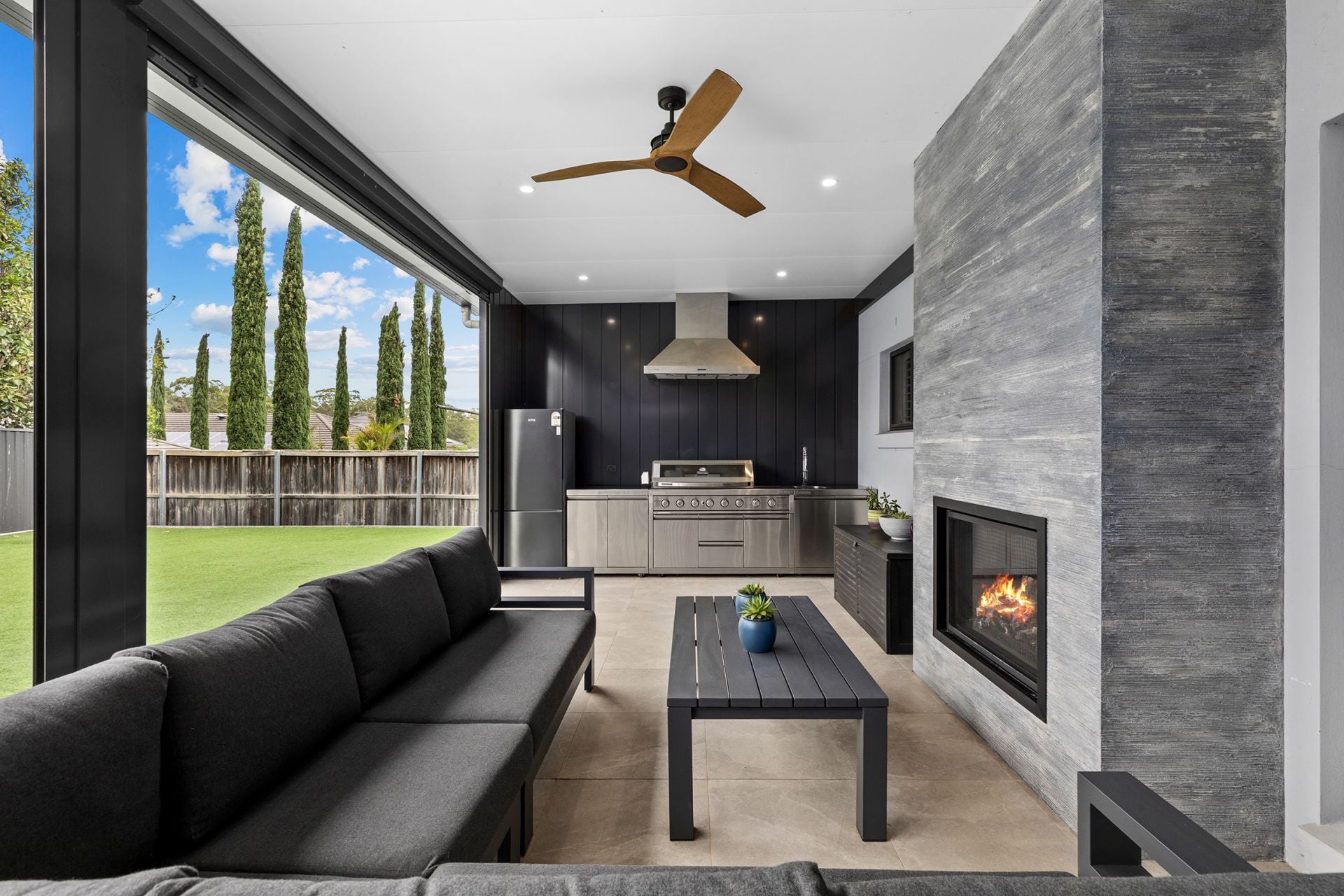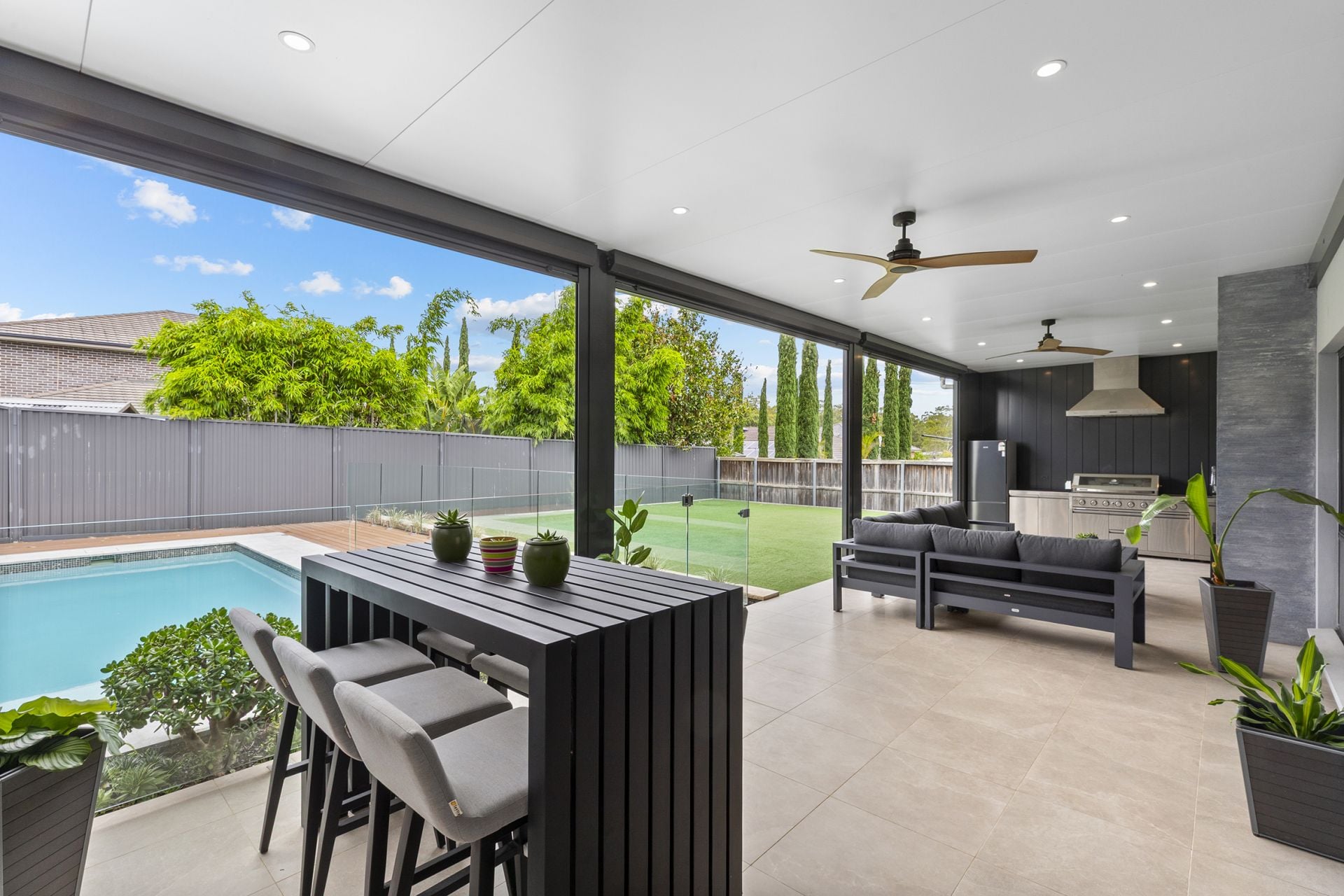 This stunning entertainer's sanctuary has been meticulously crafted for families who appreciate both style and sophistication. From its commanding street presence, the home unfolds to a flexible lower level featuring a formal lounge, expansive family and dining areas with a dedicated theatre room ideal for cinematic nights at home. Caesarstone benchtops and sleek cabinetry frame the incredible gourmet kitchen which includes an island bench setting, breakfast bar seating area, quality cooking appliances and a butler's-style pantry. Dual glass sliders create a seamless flow to the alfresco entertaining area, complete with a outdoor kitchen and barbecue, custom fireplace and external automatic blinds making the space usable year-round. The child and pet friendly backyard also features a pool, manicured lawns and beautifully landscaped gardens.