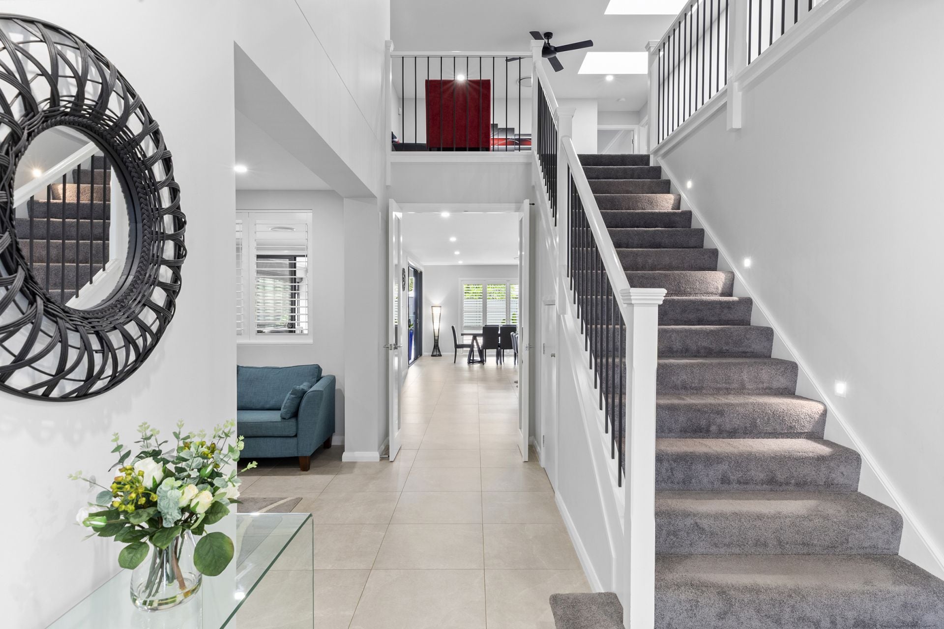 Upstairs, a rumpus room offers potential as a teenage retreat and connects five well-sized bedrooms, each with a walk-in wardrobe and stylish ensuite. The master suite offers a luxurious retreat, featuring a sitting zone and a spa-inspired ensuite with double vanity and free-standing bathtub. Promising a lifestyle of convenience, the home is a short stroll to buses, Kellyville Memorial Park Reserve and Woolworths Kellyville Grove, and only 9 minutes to Castle Towers and 10 minutes to Rouse Hill Town Centre.
