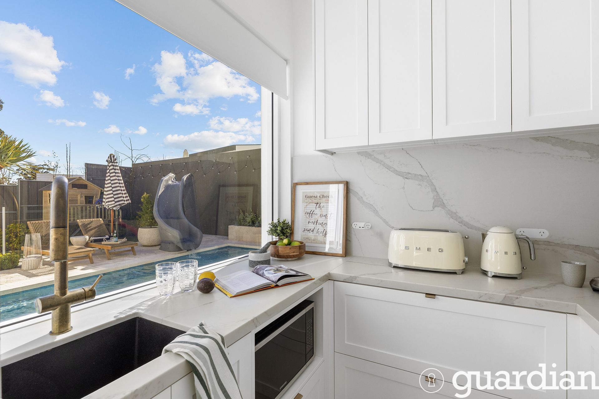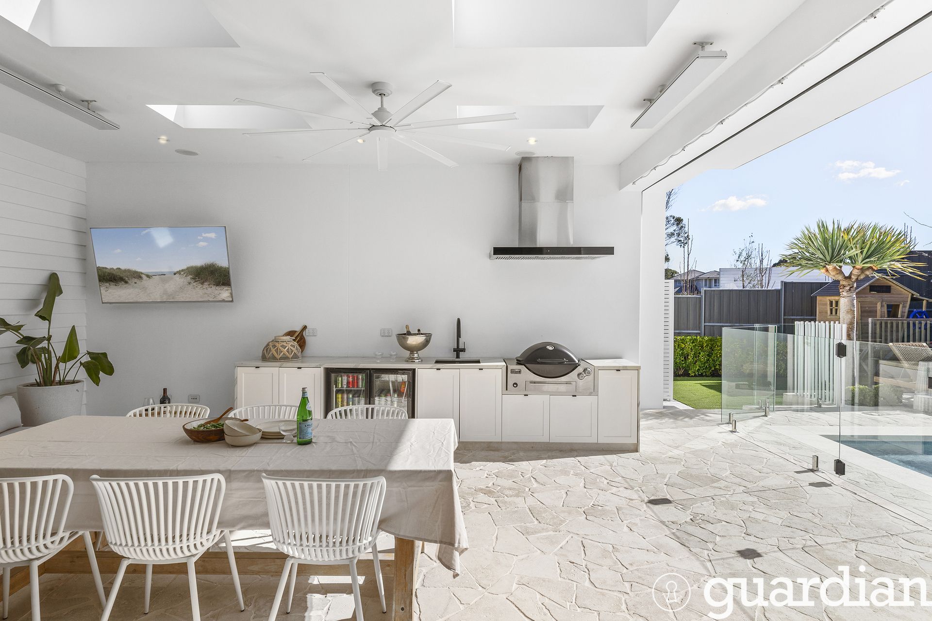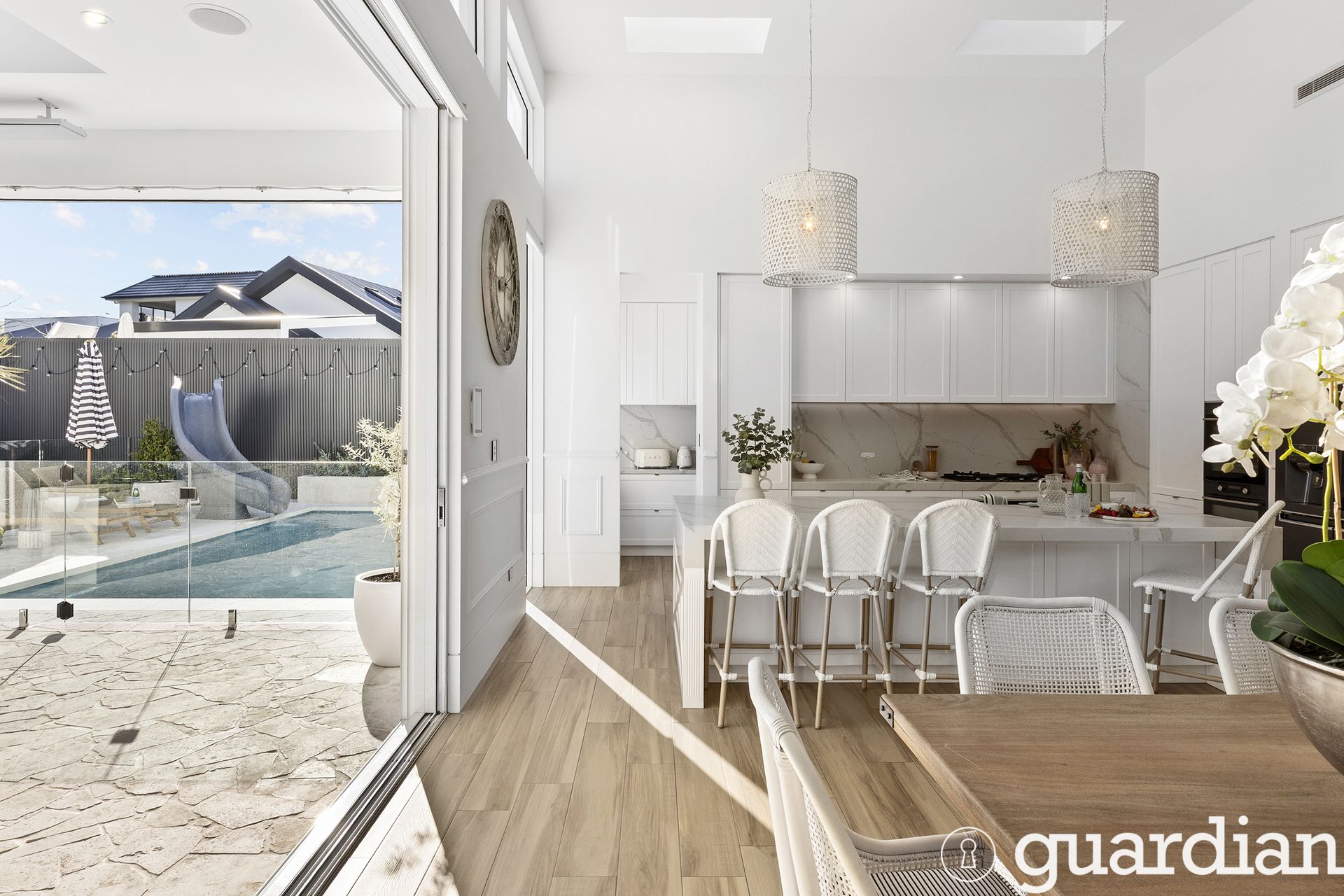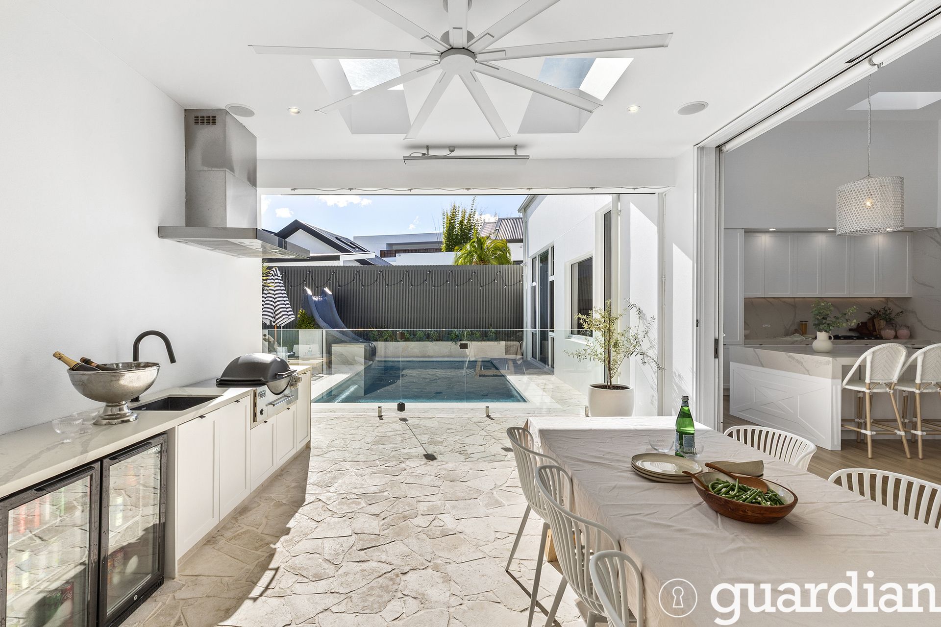 Outdoors, the lifestyle continues with a fully automated pool with in-floor cleaning system and a heated all-weather alfresco complete with Sonos sound, ceiling fan, heaters, and weather blinds - creating the perfect year-round entertaining space. A dedicated outdoor powder room and outdoor shower add to the ease and comfort of entertaining. The backyard enjoys all-day sun over the pool and entertaining areas, with breathtaking sunsets that bathe the pool and garden in golden light each afternoon.