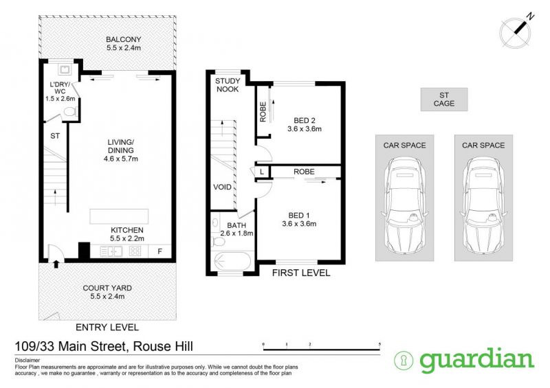 • Two car spaces with additional storage cage