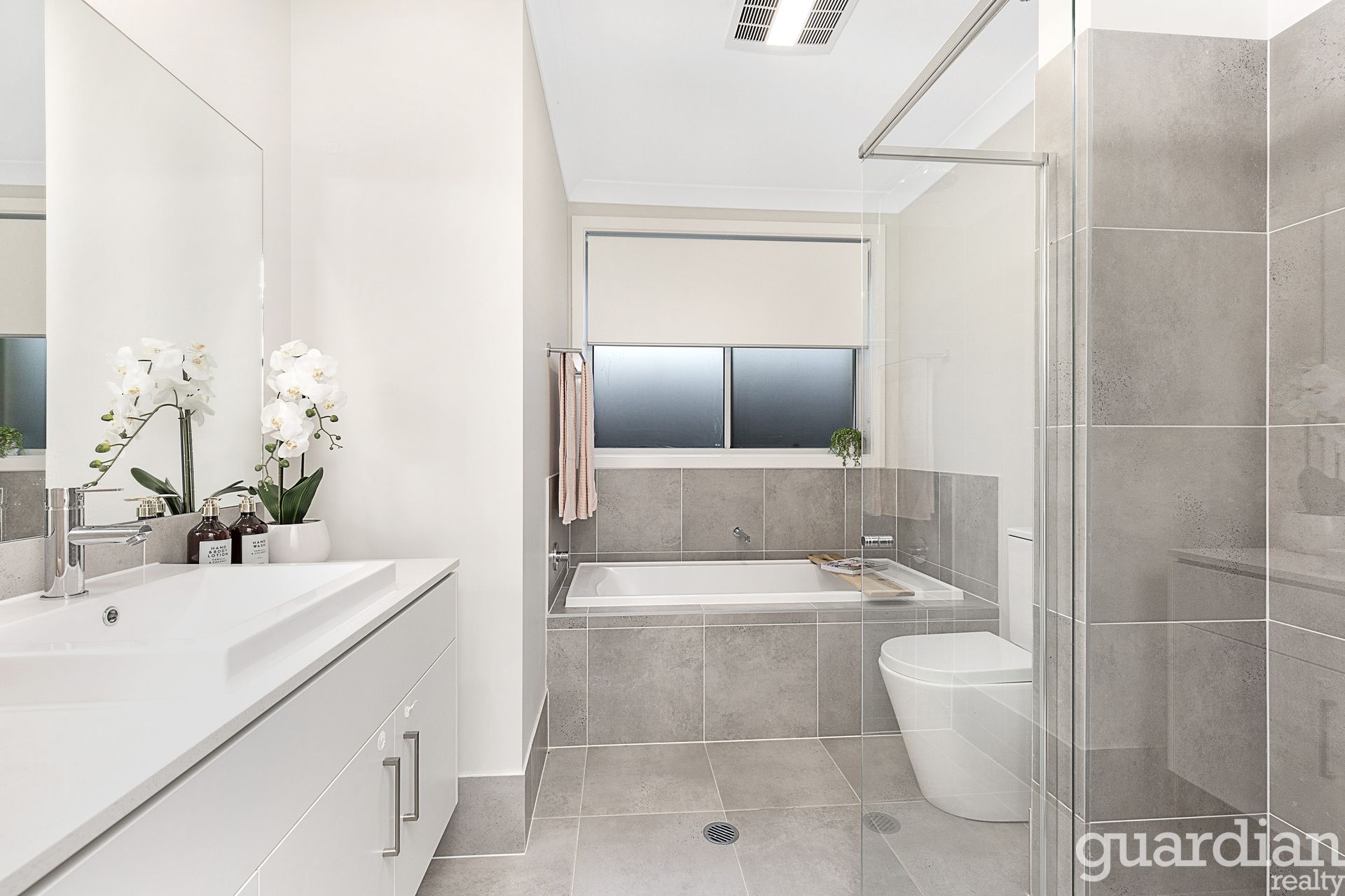 • Generous family bathroom with a contemporary aesthetic