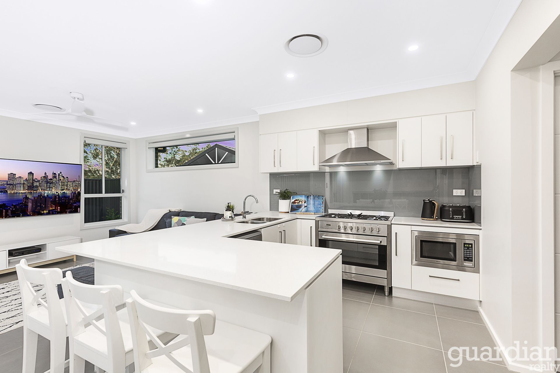A premier residence in the flourishing suburb of Riverstone, this is a brand new Elderton Home. Its single level layout affords space for everyone to enjoy in the most modern of surrounds. An open lounge room under a bulkhead ceiling is thoughtfully set apart from the main living areas. The Caesarstone kitchen articulates the living room and meals area, boasting immense storage with a walk-in pantry. Stainless steel appliances include a 900mm gas cooktop and oven, while the bench wraps around to include bar seating.